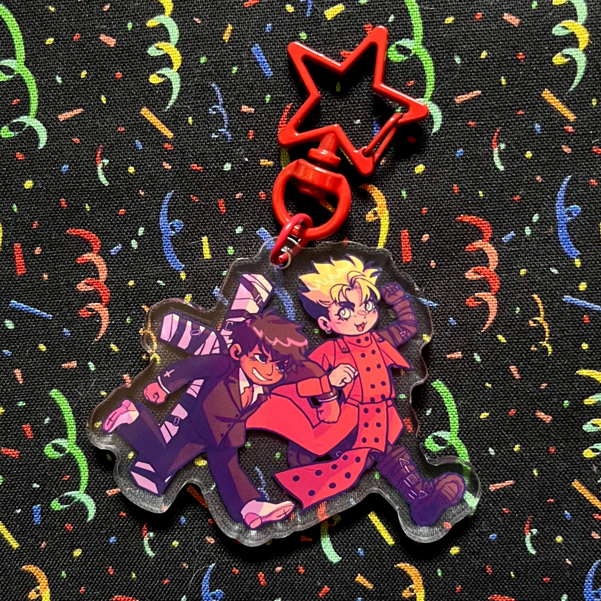 2.5 inch wide double-sided acrylic charm featuring Trigun Maximum vash and wolfwood getting into shenanigans of your choosing. Matte red star clasp!