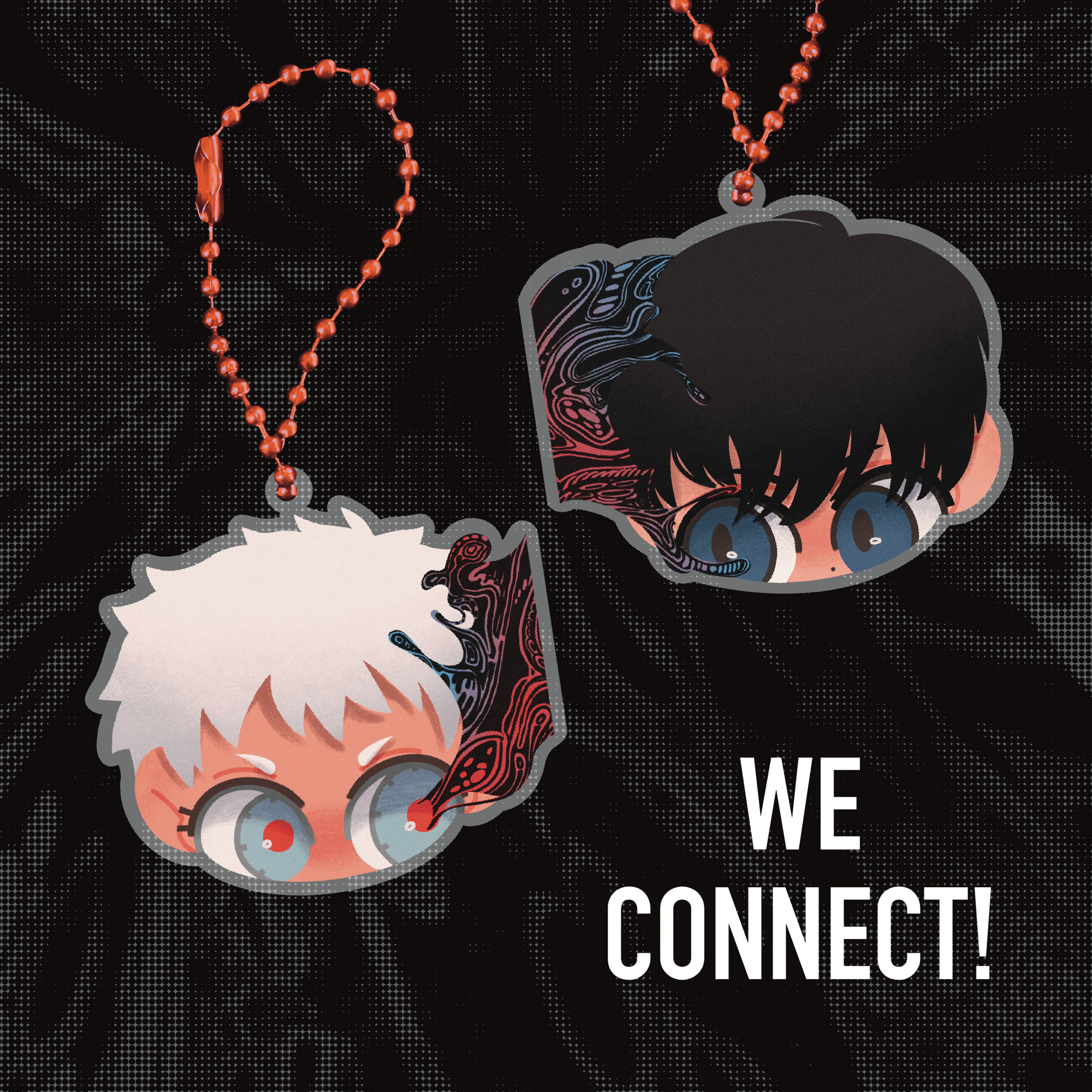 Double-sided magnetic acrylic charms on red ball-bead metallic chains.
